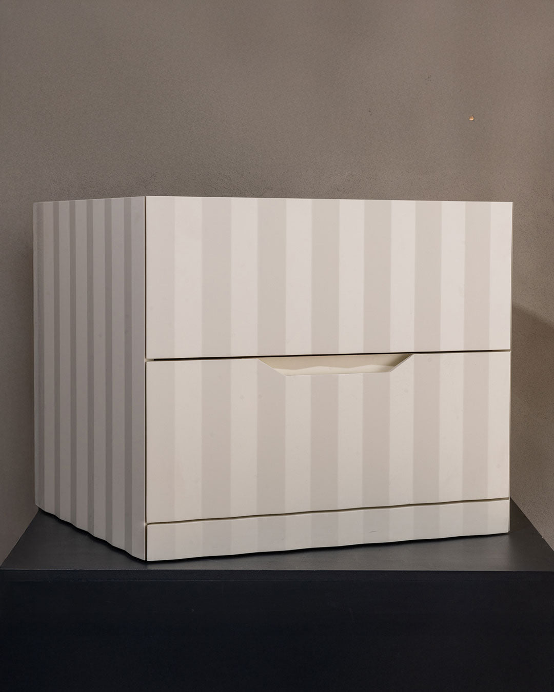 The Hug bedside table represents a perfect balance between form and function: an elegant yet practical container, with volumes defined by pleated decorations, functional edges, and intuitive drawer openings. Ideal for modern, sophisticated spaces with a strong artisanal and material element.