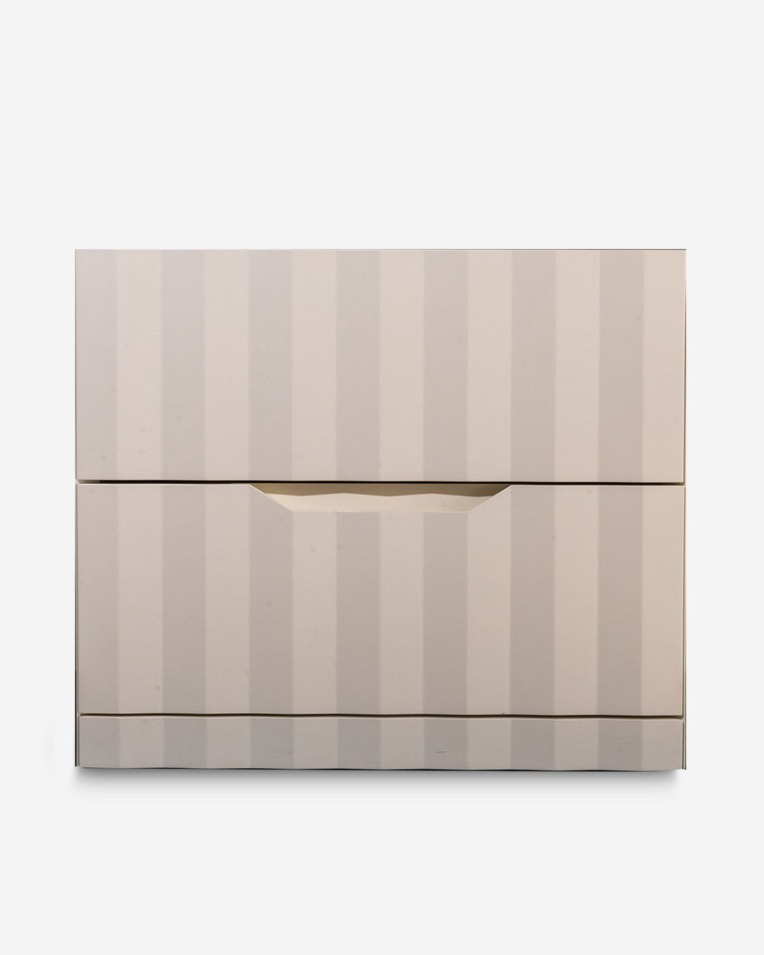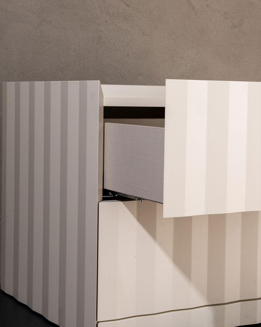 The Hug bedside table stands out for its sculptural and light presence, without sacrificing functionality. The top is framed by raised edges that slope slightly inward, a solution that makes it easier to open the drawers. The external surface is enriched by a continuous vertical pleated motif, capable of creating a suggestive chiaroscuro effect that gives depth and lightness to the volume.