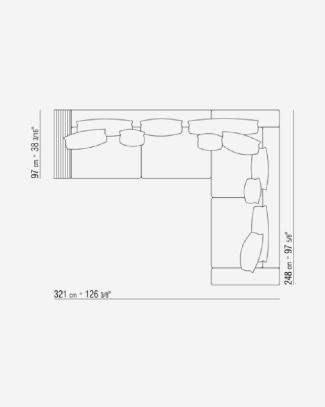 Seat : cushions padded with goose down with polyurethane insert (100% polyurethane available upon request), for a “soft floating” but supported effect.
