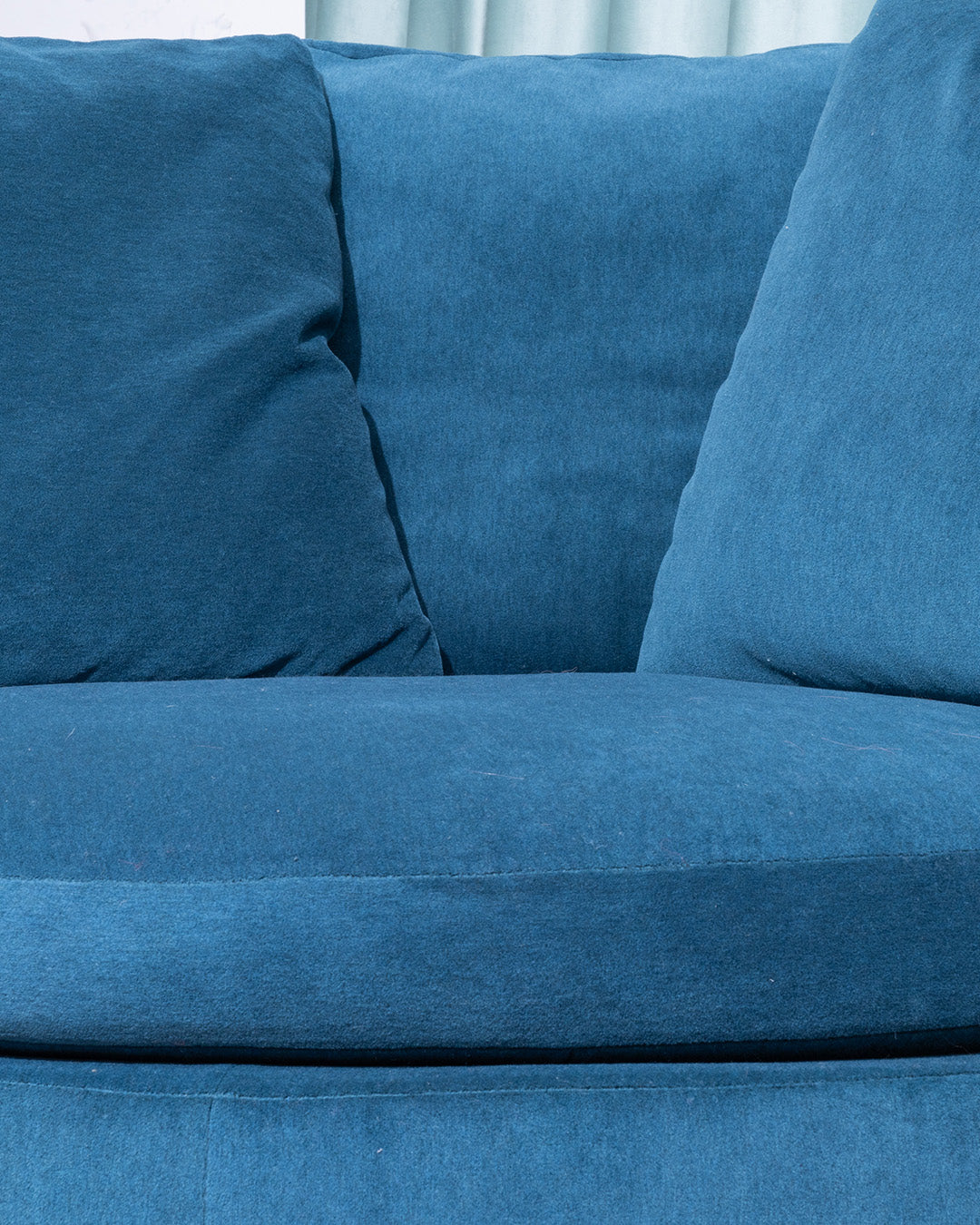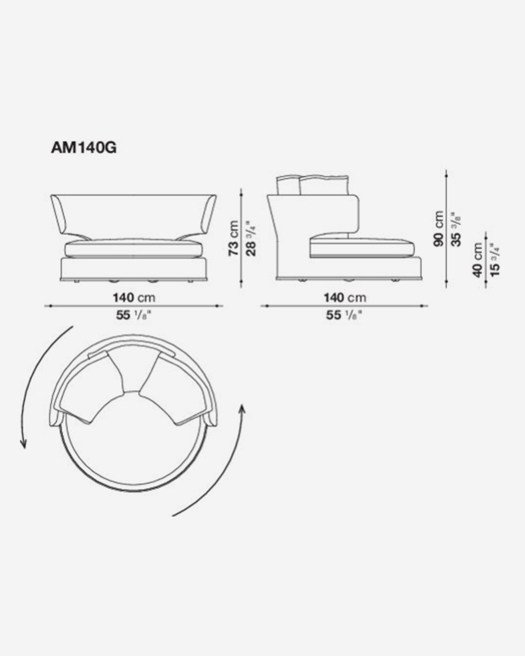 The perfectly round shape with partial backrest and movable cushions makes it an ideal element to be placed in the centre of the room , where it can rotate freely on itself thanks to the integrated swivel base , making movement part of the seating experience.