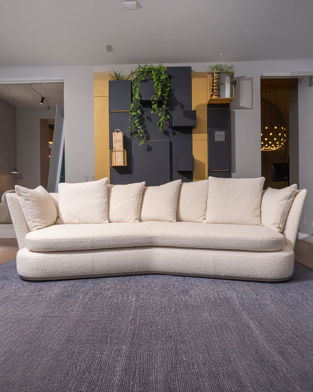 Voluminous and modular back cushions , covered in the same bouclé for aesthetic continuity, removable for easy maintenance.