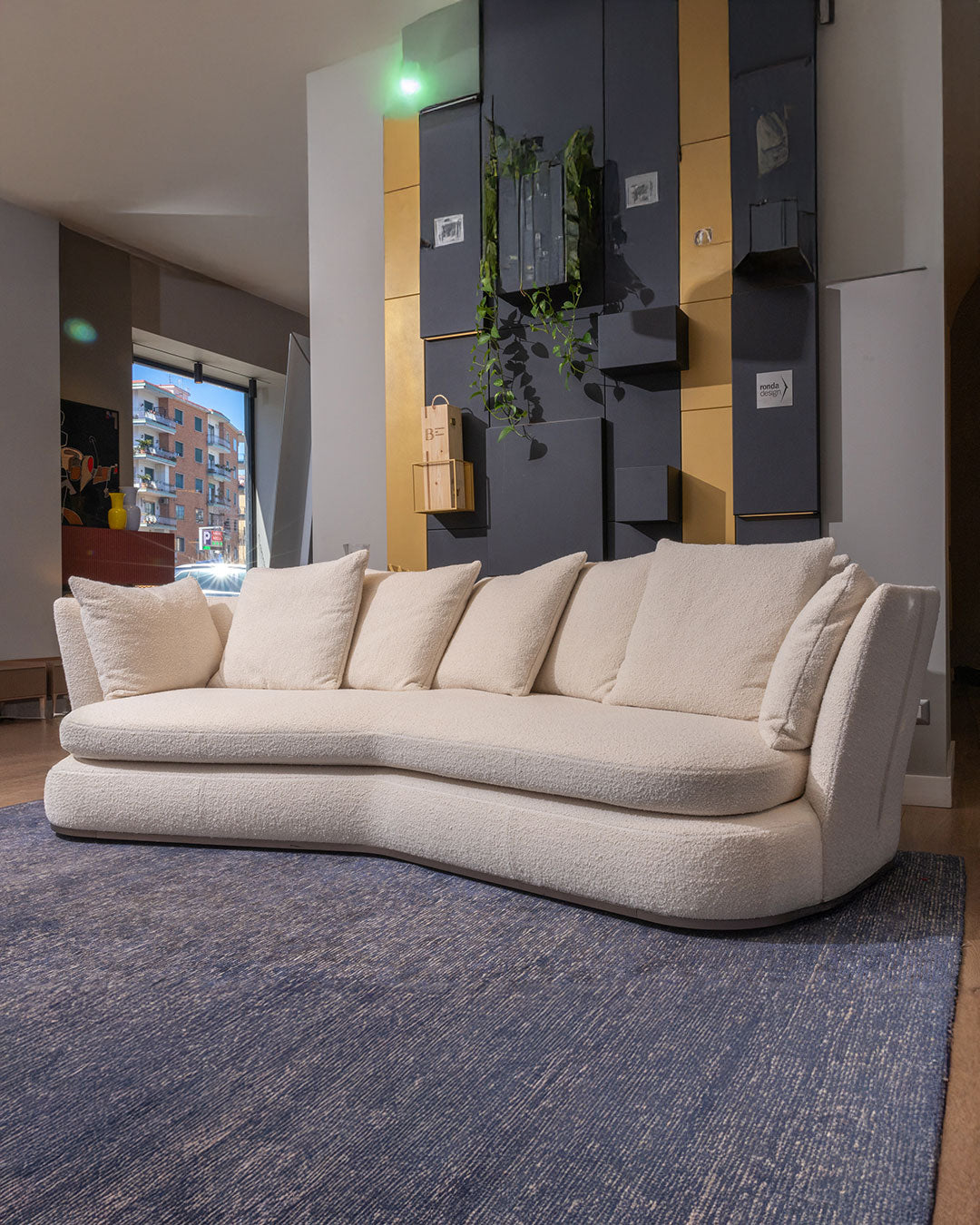 Sila 100% White Bouclé Fabric : The upholstery is made of a fine ecru bouclé, soft to the touch and visually rich. This type of fabric is prized for its three-dimensional texture, which gives the sofa a warm, textured, and sophisticated look.