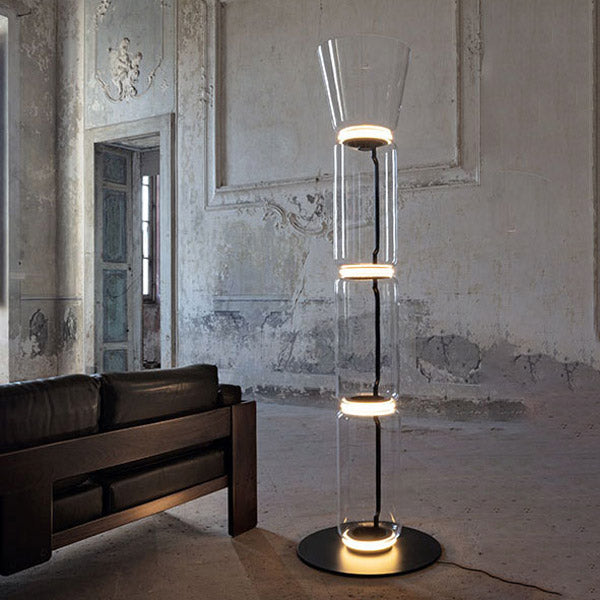 Lampade da terra composta da moduli in vetro che si connettono fra loro cosi da raggiungere un altezza di 2,17 metri (85.43").