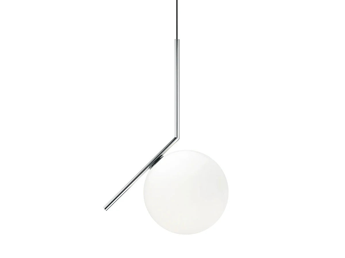 IC Lights S2 is a pendant lamp characterised by a minimal yet poetic composition: a thin vertical metal rod and an opal blown glass sphere , which seems suspended in a delicate point of balance.