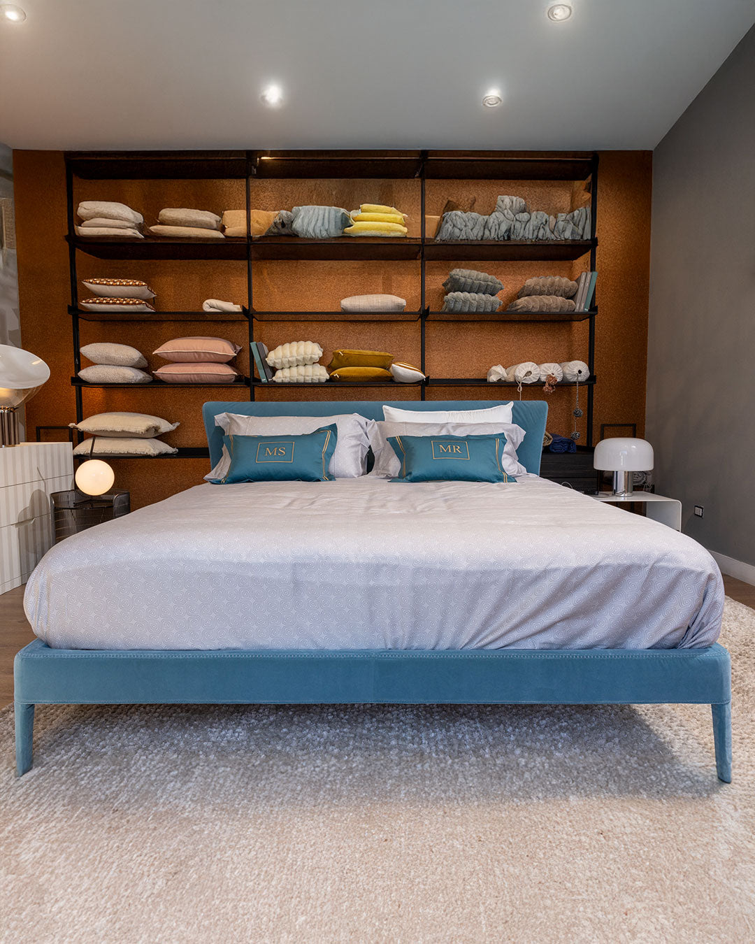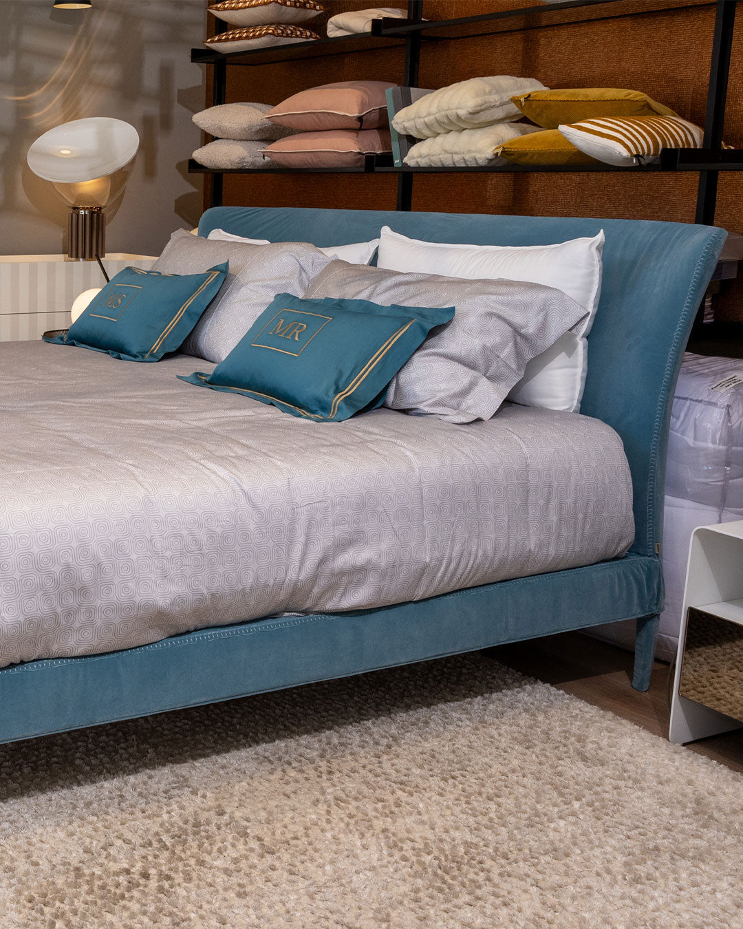 The proportions are perfectly balanced: the padded bed frame and headboard blend harmoniously into a single body, while the feet, also covered in fabric, ensure absolute material continuity that expresses sartorial elegance.