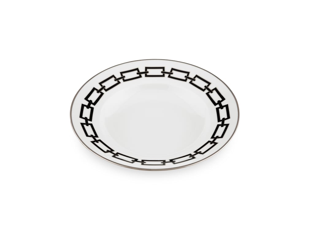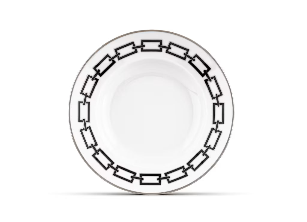 Piatto fondo in porcellana con decoro nero e platino. CollezioneCatene di Gio Ponti.