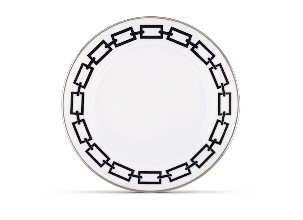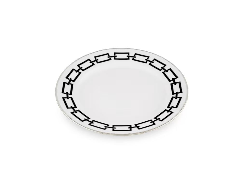 Piatto piano in porcellana con decoro nero e platino. Collezione Catene di Gio Ponti.