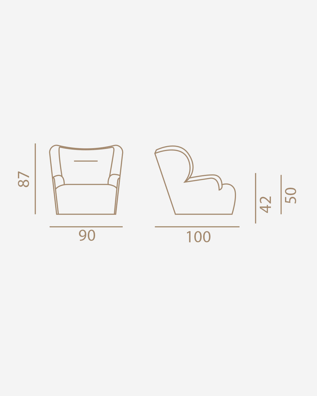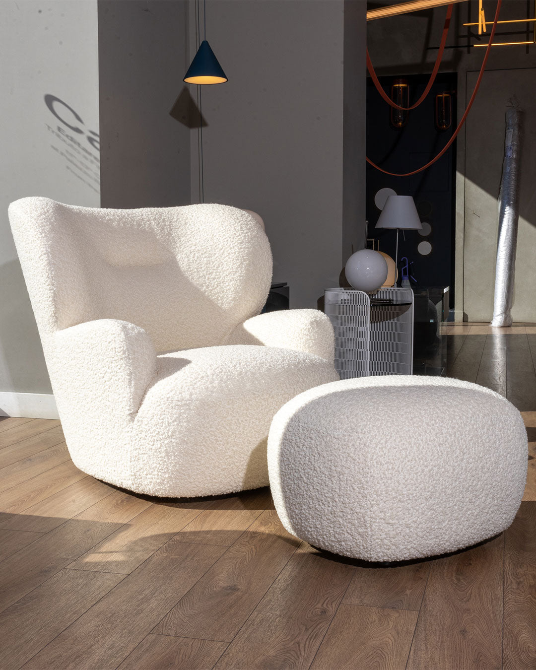 The pouf, with its organic and compact shape, is designed as a natural extension of the armchair, to promote total relaxation or act as an additional seat. -