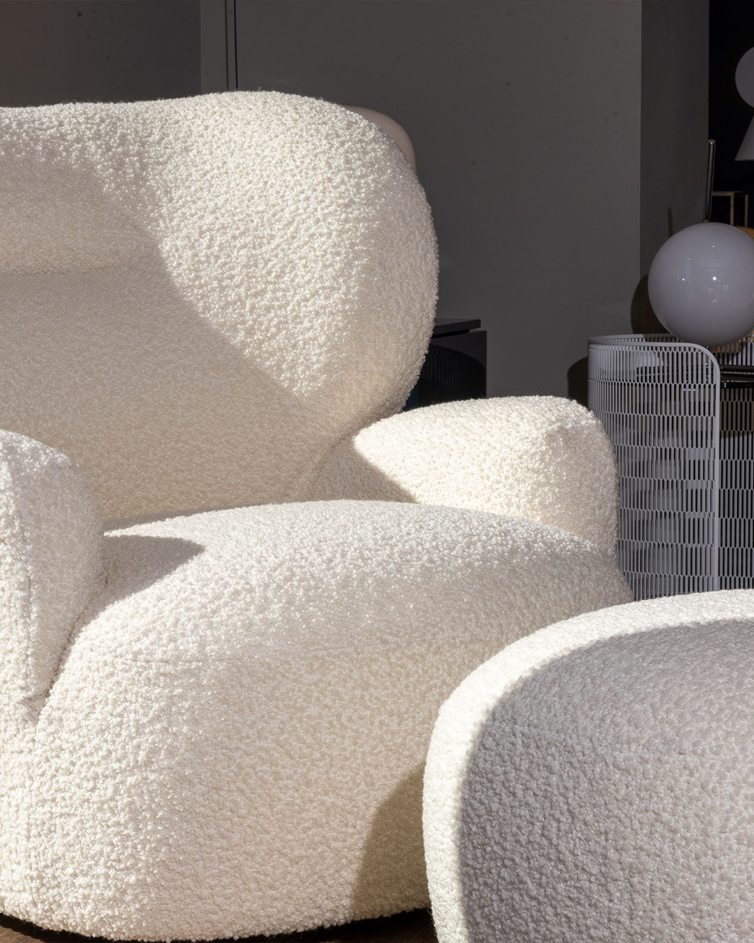 The extremely tactile bouclé fabric gives a warm and contemporary look, with a neutral palette that enhances natural materials, light woods or dark stones. -