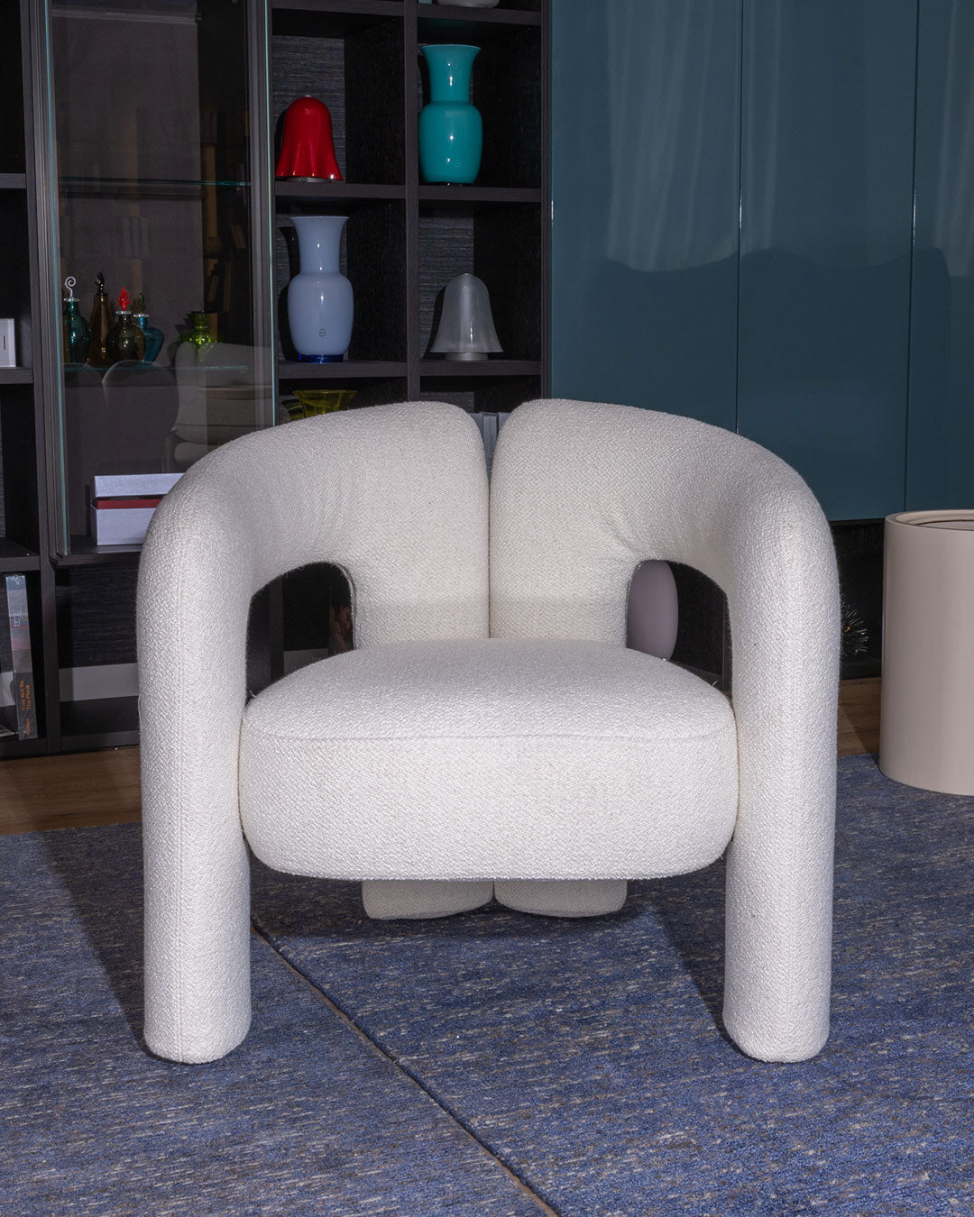 The Dudet Armchair by Cassina , designed by Patricia Urquiola . Launched in 2022, the Dudet represents a perfect balance between formal experimentation and a sustainable approach, embodying the ironic and sensual spirit of contemporary Italian design.