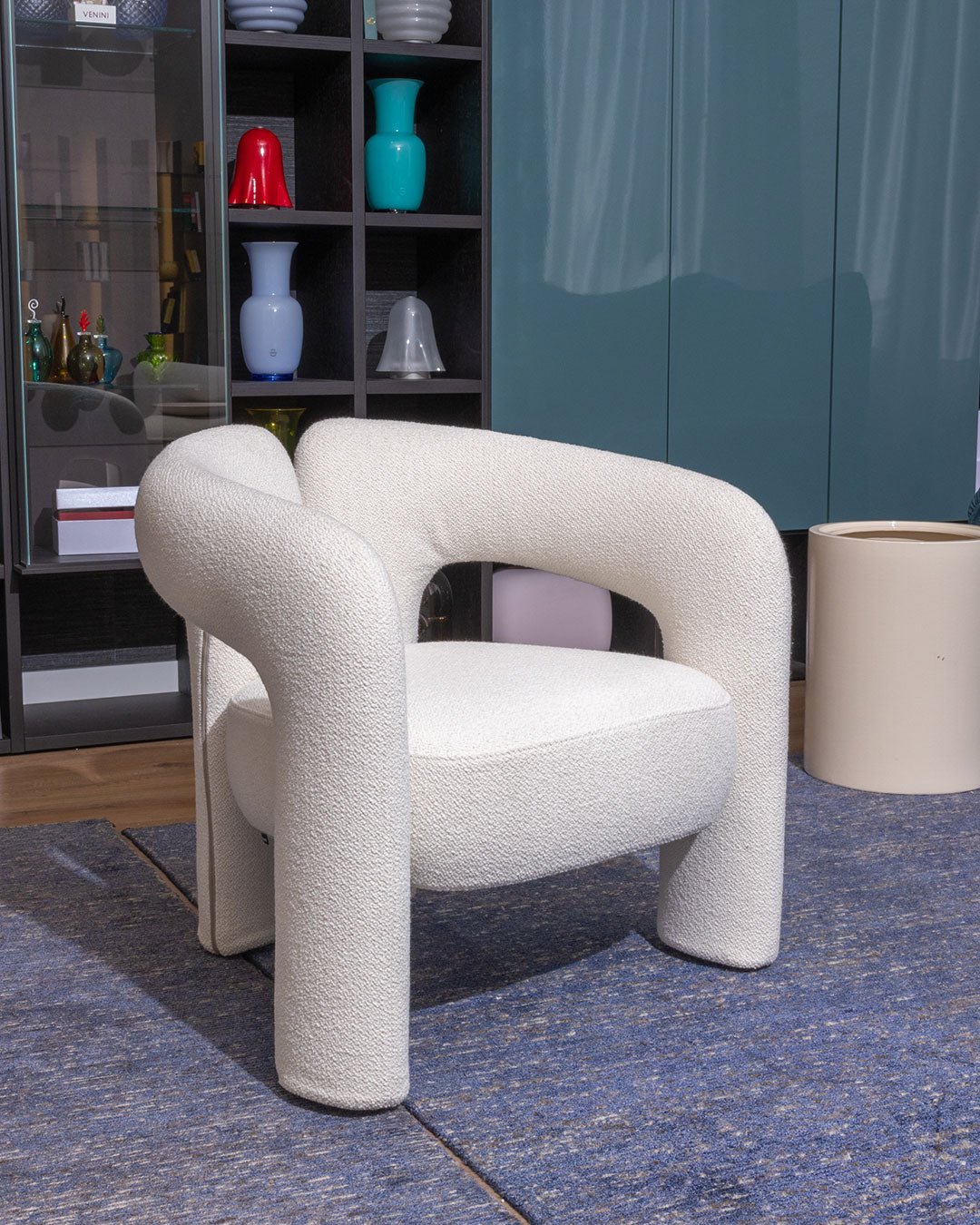 Upholstery : Fully removable (in the fabric versions), available in a variety of Cassina finishes. The photo shows a version in white bouclé fabric , which enhances the soft volumes and creates a refined interplay of materials.