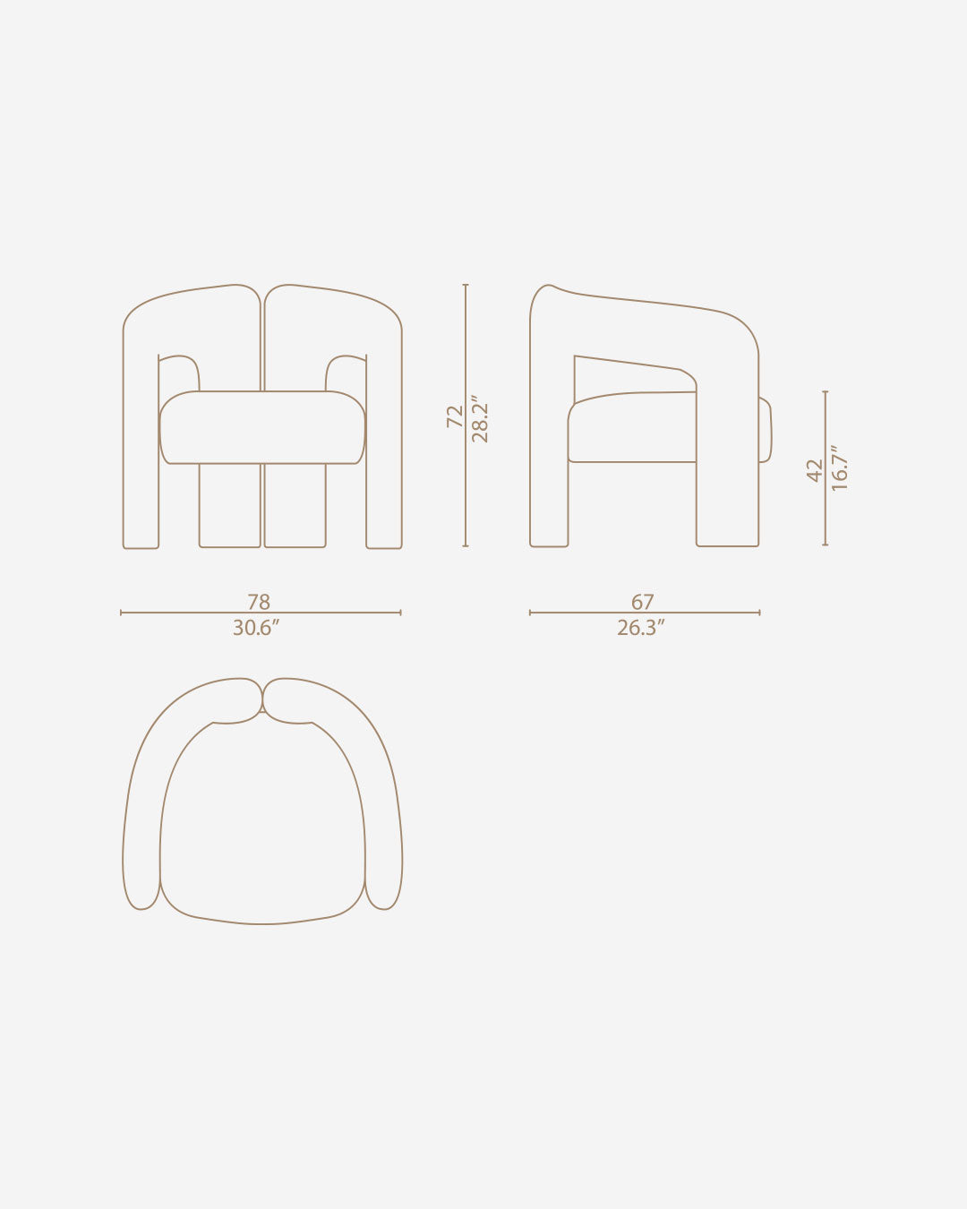 Base : the “legs” of the armchair, integrated into the armrests, rest directly on the ground without visible feet, reinforcing the sculptural and monolithic effect.