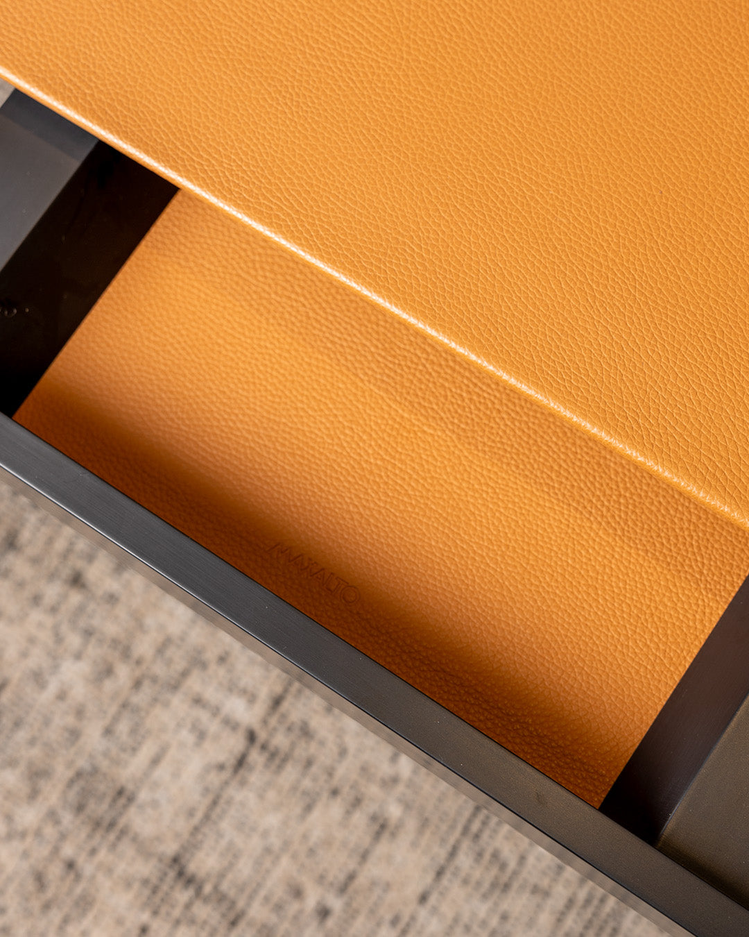 The desk can be equipped with one or more pull-out drawers with a concealed opening system, perfect for storing stationery or small items. The overall effect is elegant and discreet, designed for high-end domestic or professional environments.