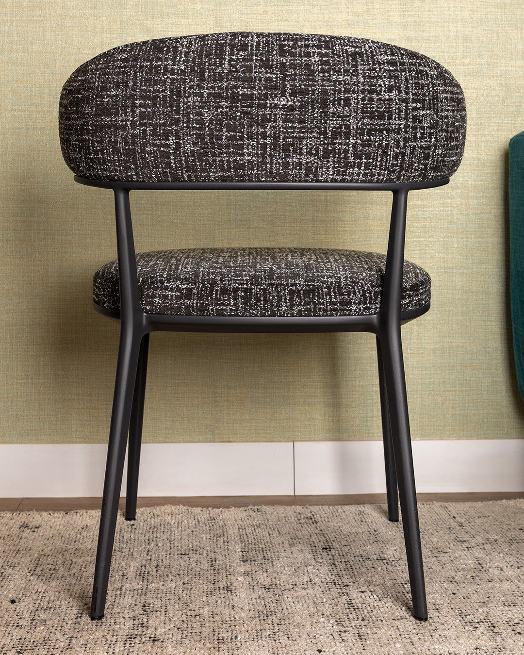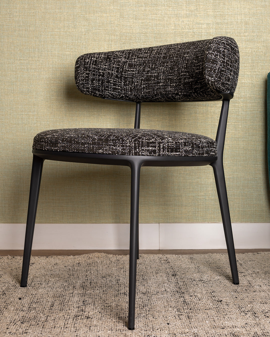 The black/white melange covering with a material texture gives a contemporary graphic character , without sacrificing sobriety.