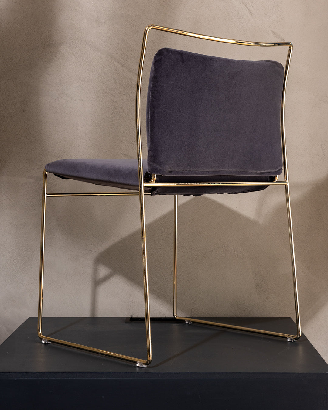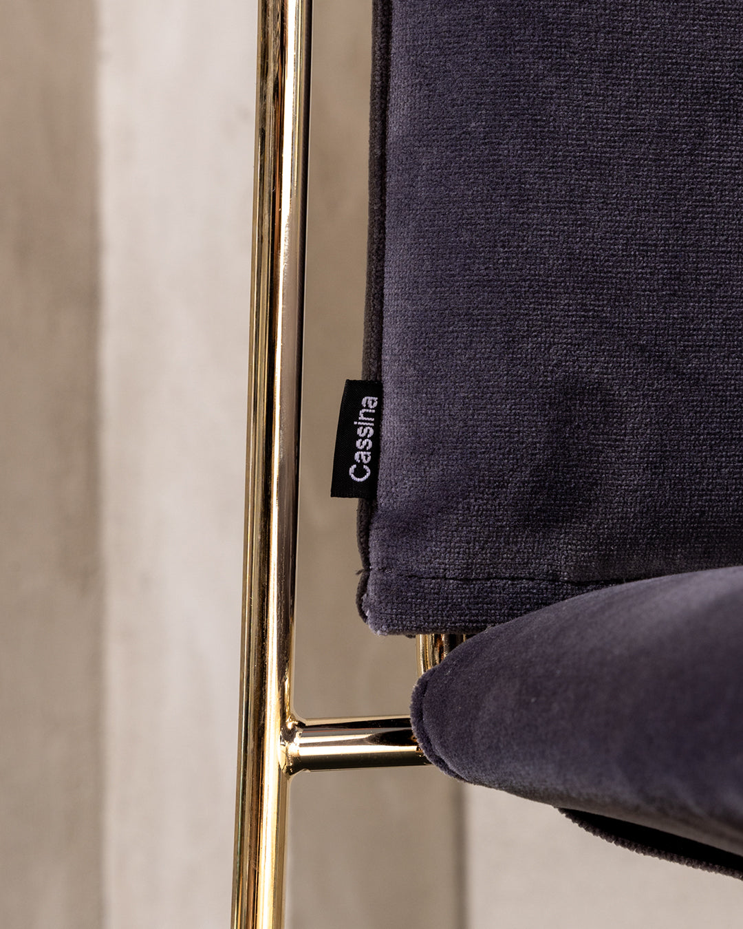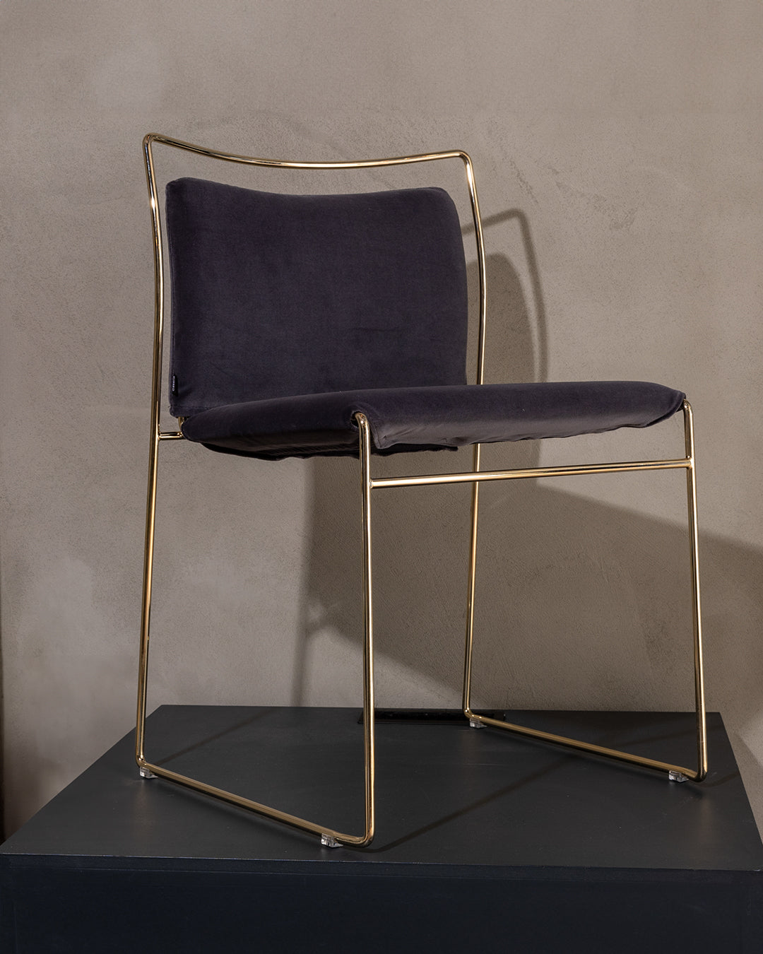 In the version pictured: metal frame with a shiny gold finish and anthracite velvet padding, which gives the chair a sophisticated and luxurious tone, perfect for exclusive residential or hospitality contexts.