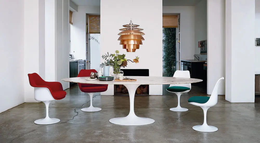 Tulip Saarinen Knoll Tavolo grande piano marmo statuarietto è un tavolo purista che trasforma una forma essenziale in un’icona di eleganza. L’arredo è disegnato da Eero Saarinen e in questa versione presenta un piano in marmo statuarietto.