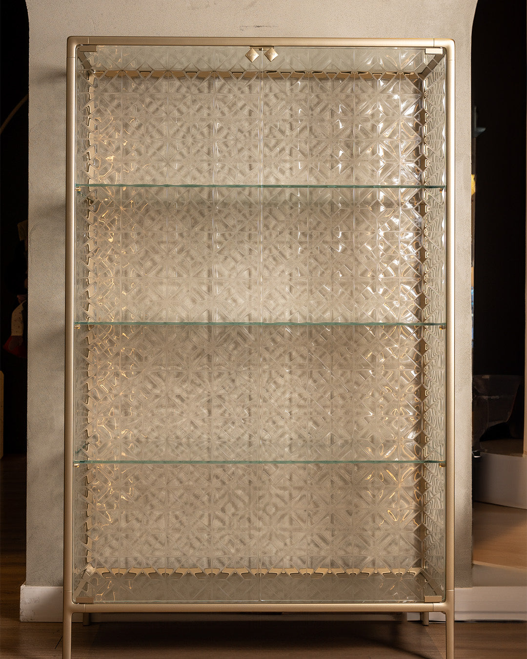 The Echo display case, designed by Marcel Wanders & Gabriele Chiave , is an inhabitable sculpture conceived as a reflective device: the molten glass texture creates a prismatic effect that visually “bounces” between structure and setting.