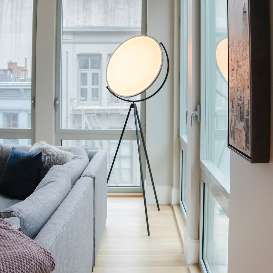La lampada Superloon nella variante nera, una lampada da terra di alta gamma progettata da Jasper Morrison per Flos, iconica per il suo design sofisticato e futuristico ispirato alla forma della Luna piena.